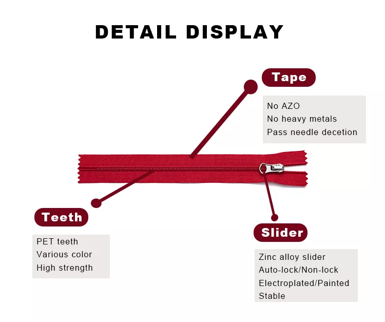 TRC標準ナイロンジッパーは、高品質のポリエステルと高強度ナイロン歯から丁寧に作られています。軽くて丈夫な設計なので、スムーズな開閉と耐久性にも優れています。最も広く使用されているジッパーの中で、この製品は優れた耐久性とシルクのように滑らかな感触を備えており、衣類、カバン、リネン、アウトドア用品に最適です。