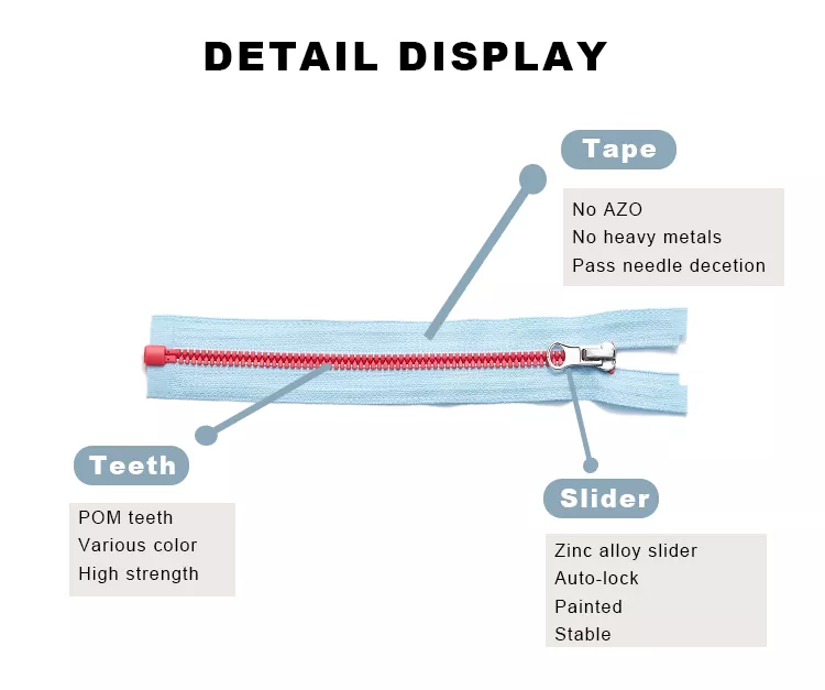 TRC 標準プラスチック ジッパーは、プレミアム POM またはその他の堅牢で耐久性のあるプラスチックから製造され、精密射出成形によりスムーズで楽なジッパー アクションと優れた耐摩耗性を保証します。各ファスナーには耐久性のあるポリエステルテープが使用されており、頻繁に使用しても確実な動作を保証します。さまざまな特殊なカラーが用意されているこれらのジッパーは、優れた耐色堅牢度を示し、繰り返し洗濯したり、光や湿気に長時間さらした後でも鮮やかな色合いを保ちます。