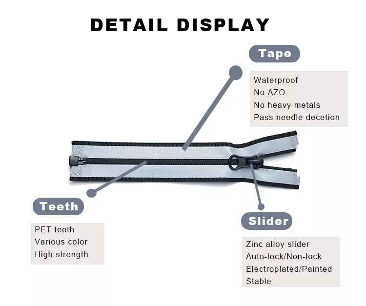 TRC 耐水性ナイロン ジッパーは、高密度ナイロンの歯と強化ポリエステル テープでできており、その上に耐久性のある TPU または PU フィルムが重ねられています。これにより、ジッパーの柔軟性とスムーズな操作性を維持しながら、効果的な防水性を提供するシームレスなバリアが形成されます。屋外および高性能用途向けに設計されたこの製品は、耐久性のある耐摩耗性、耐腐食性、耐変形性を備えています。ジャケット、スポーツウェア、バックパック、テント、保護具のいずれに使用する場合でも、TRC 耐水性ナイロン ジッパーは機能的な保護とモダンなデザインの理想的なバランスを実現し、あらゆる細部がスタイリッシュで機能的であることを保証します。